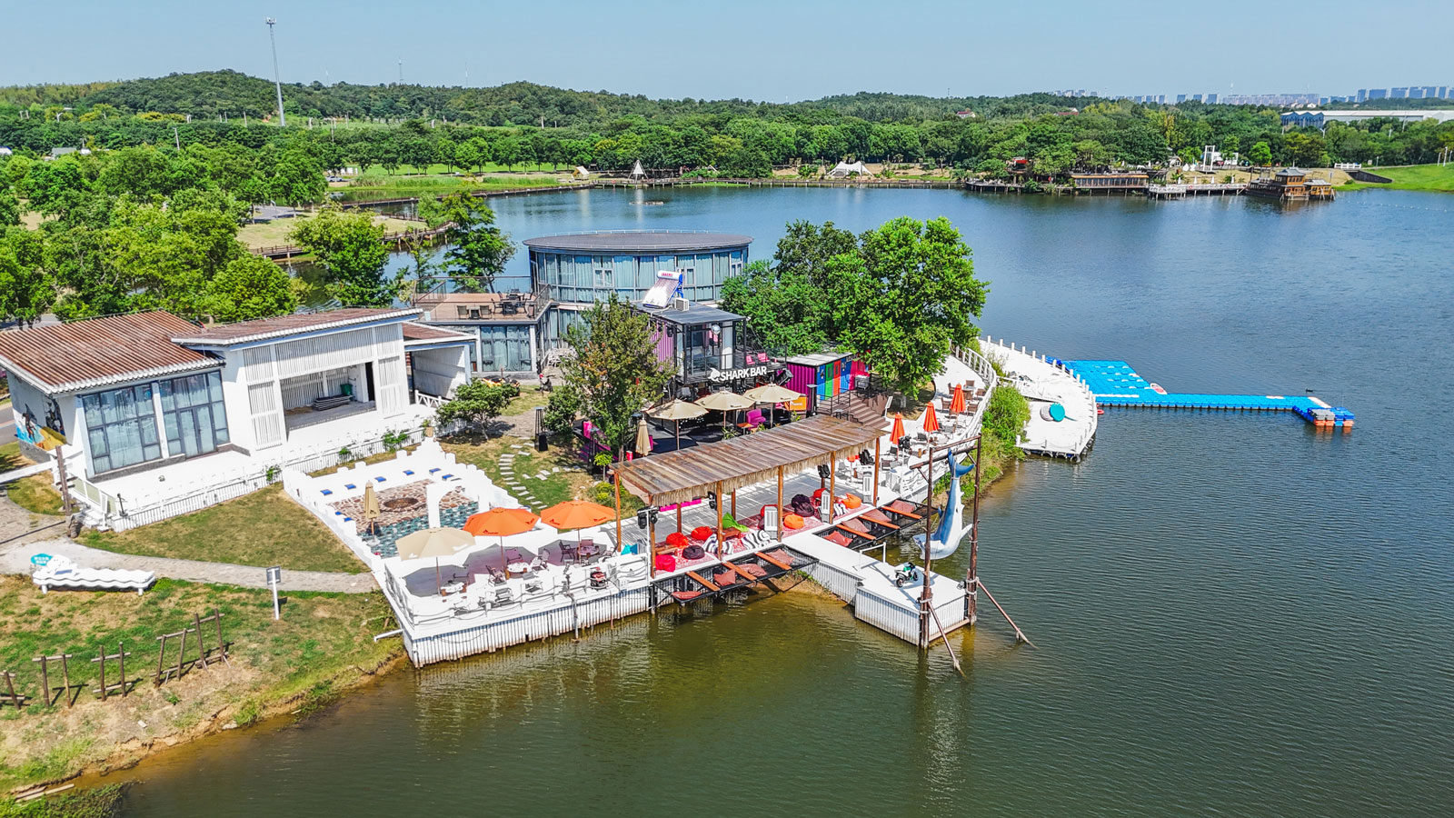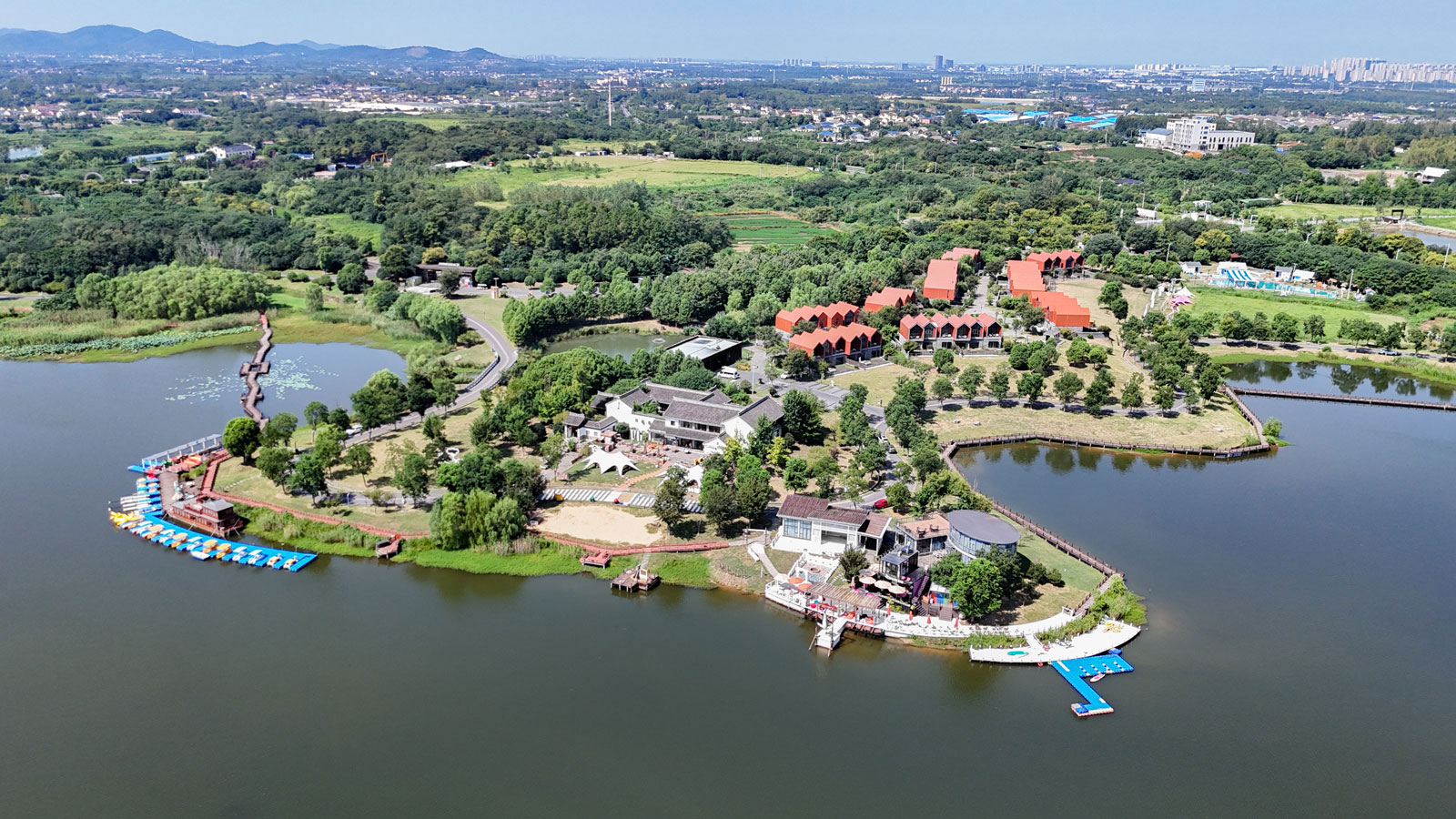 园区涵盖餐饮、住宿、会务、休闲娱乐、旅游观光等多个服务领域,全方位满足游客多样化需求。住宿区域特色鲜明,其中半岛别墅主打轻奢舒适,每套套房均配备独立观景庭院,景致宜人;三卧套房的临湖观景庭院更是可近赏湖景、远眺牛首山,惬意十足,且所有房间均设有开放式厨房,方便家人、朋友共同烹饪美食。半山民宿充满创意,由10栋双层集装箱建筑组成,每栋由3至4个箱体拼接而成,不同颜色对应不同房型,楼上超大露台与门前宽阔门廊,让游客在入住期间可尽情领略自然风光。房车营地尽显自由随性,占地约15亩,包含12栋独栋房车和10辆进口品牌营地车,车内冰箱、酒柜、吧台、简易厨房、餐桌及浴室等设施一应俱全;此外,园区还设有二十余个配备水电桩的空车位,可满足自驾房车游客的使用需求,插卡即可便捷使用。整个园区共计71套客房、113间房间、167张床位,为游客提供了丰富的住宿选择。餐饮区域汇聚了云尚餐厅、云水里舍私房菜、云端宴会厅、云境宴会中心等特色餐饮场所,提供精致包间、零点、自助用餐、宴席等多元用餐形式,总计700多个餐位,无论是家庭聚会、商务宴请还是公司年会,都能找到合适的场地,让游客在品味地道美食的同时,享受细致周到的服务。会议区域设施完备,功能多样,半岛茶社面积108平方米,分上下两层,二楼设有可容纳四十余人的会议厅及小型吧台,一楼可品茶赏景、举办娱乐活动,且配备KTV功能,满足游客多元化需求;云端宴会厅面积600平方米,采用无柱式设计,空间开阔通透,可接待300至400人的大型宴会或高端会议,为各类活动提供充足灵活性与舒适度;云境宴会中心拥有270平方米的小满厅与162平方米的立秋厅,可同时容纳300人,是举办各类会议、宴会的理想之选;宴会中心外的平整草坪,还可用于举办团建、新品发布会、展销展览等商务活动。